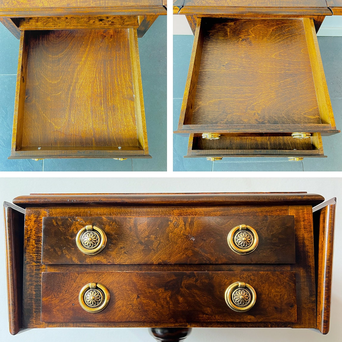 Crafted from solid wood with prominent brass claw feet, this table’s folding drop leaves extend the surface with ease and practicality. The centre section houses two shallow drawers with brass round handles, adding useful storage and visual balance. Surface patina and minor signs of age reflect its history, while the gently curved legs and ornate feet demonstrate thoughtful construction.