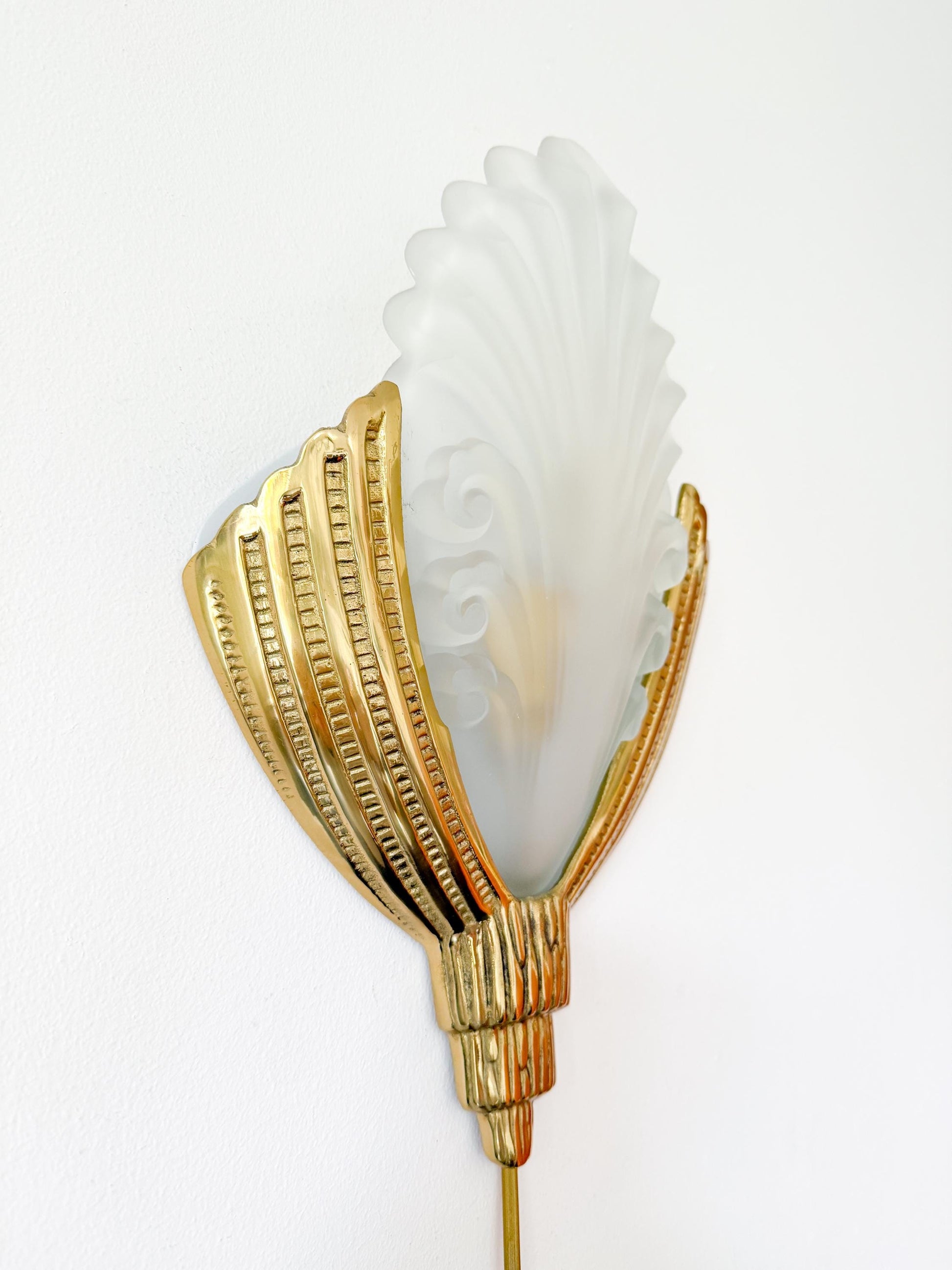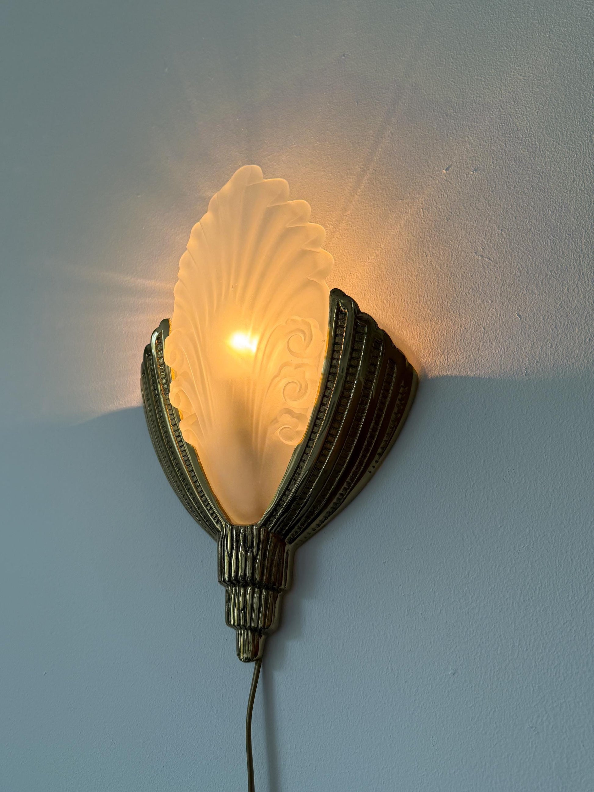 This vintage Art Deco wall sconce from the 1930s brings timeless elegance into any interior. The lamp features a solid brass frame with refined detailing and a frosted glass shade in a delicate peacock or petal shape.