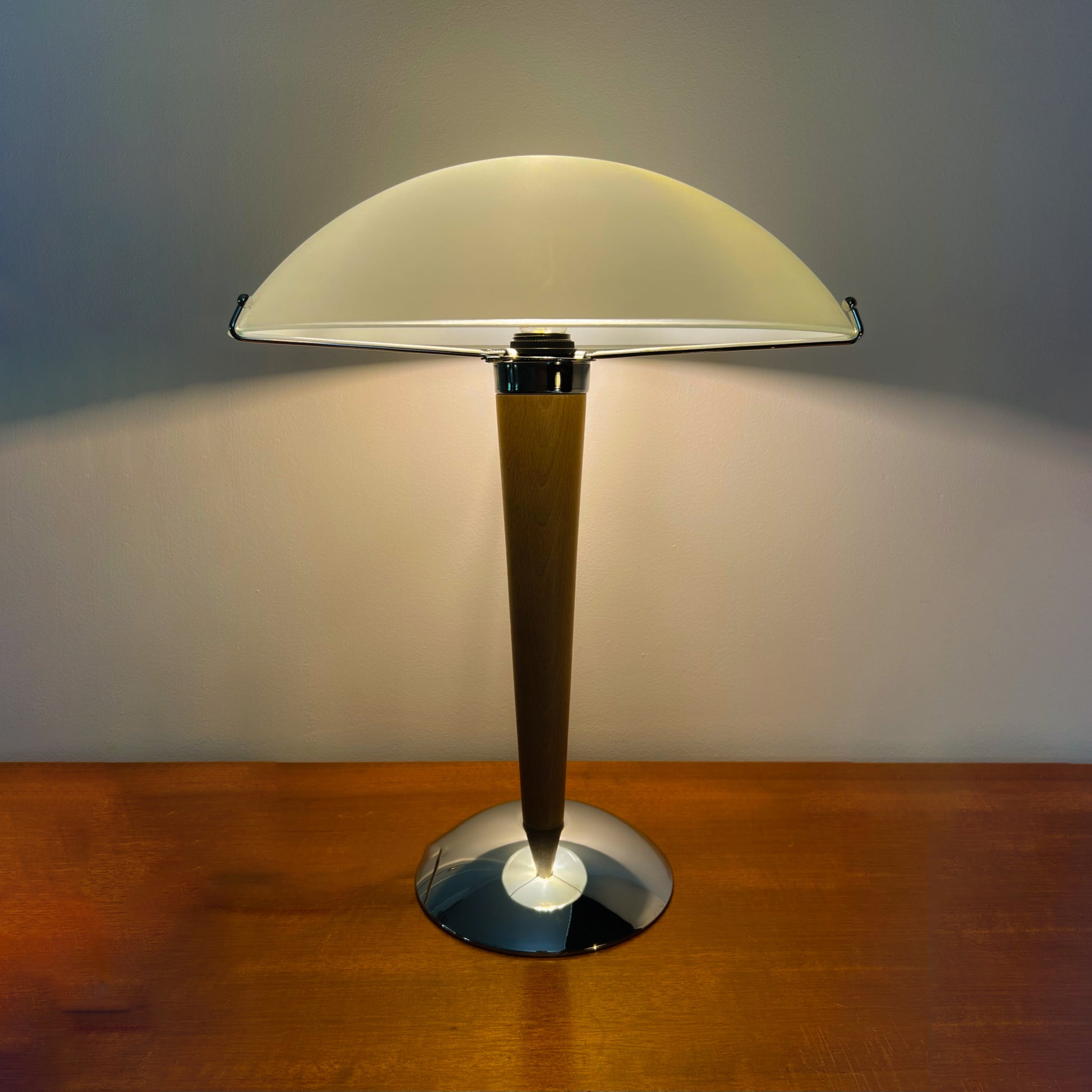 This table lamp features a frosted glass mushroom-style shade resting atop a slender beech wood stem and a chrome-plated base, reflecting the clean, functional aesthetic seen in IKEA lighting of the period. The restrained design creates a soft, warm glow suited to living spaces or bedside surfaces.