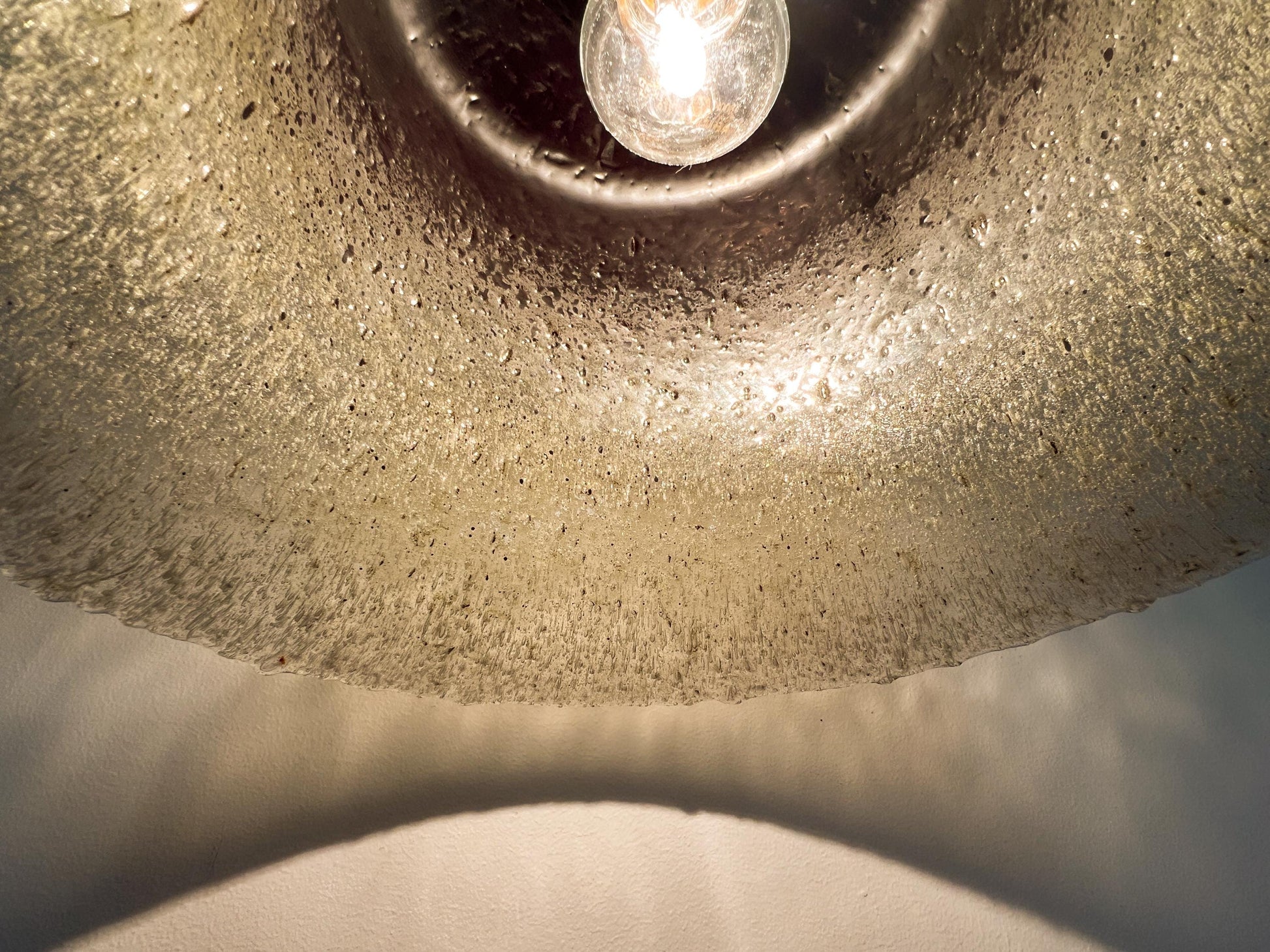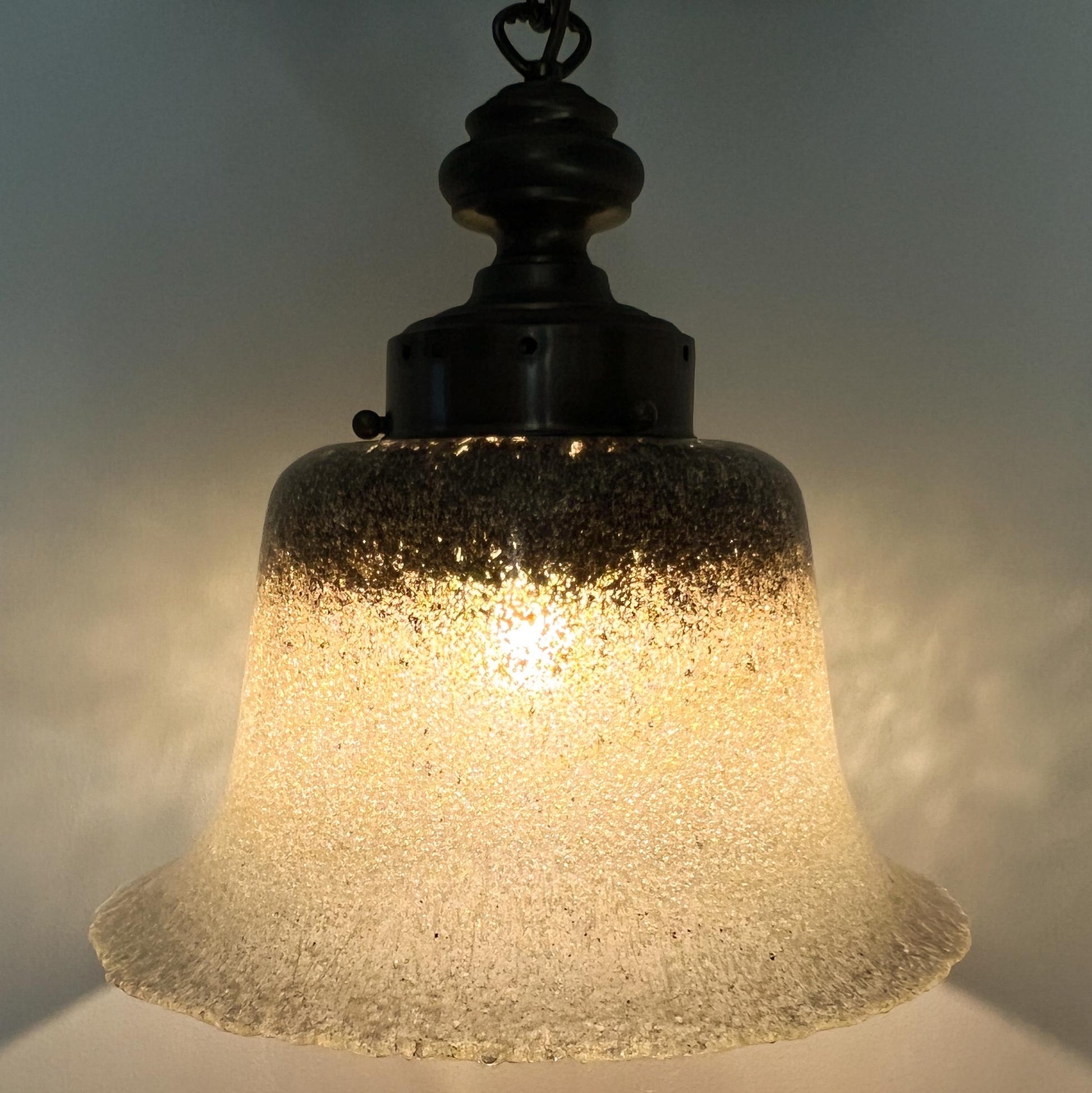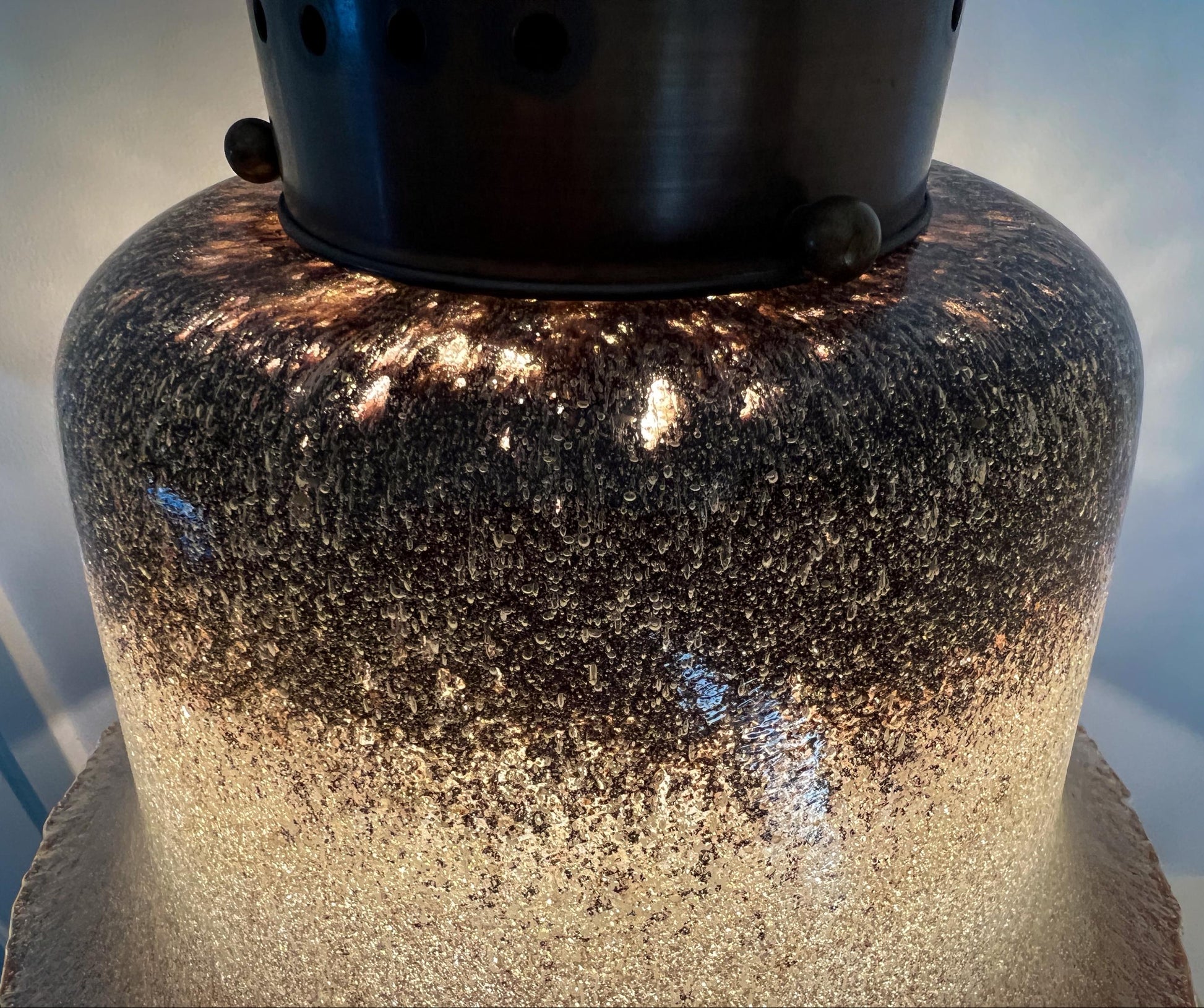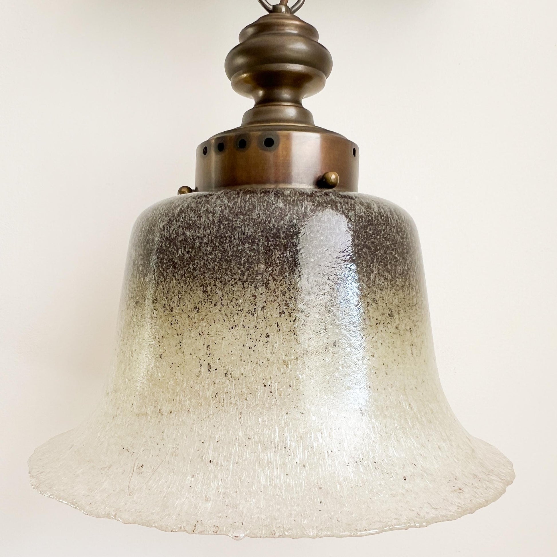 A vintage granité glass and brass pendant lamp by Peill & Putzler, embodying mid-century modern design and German lighting craftsmanship. This piece features a hand-blown glass shade with subtle relief and rich tonal depth, paired with an aged brass suspension that adds character and warmth.