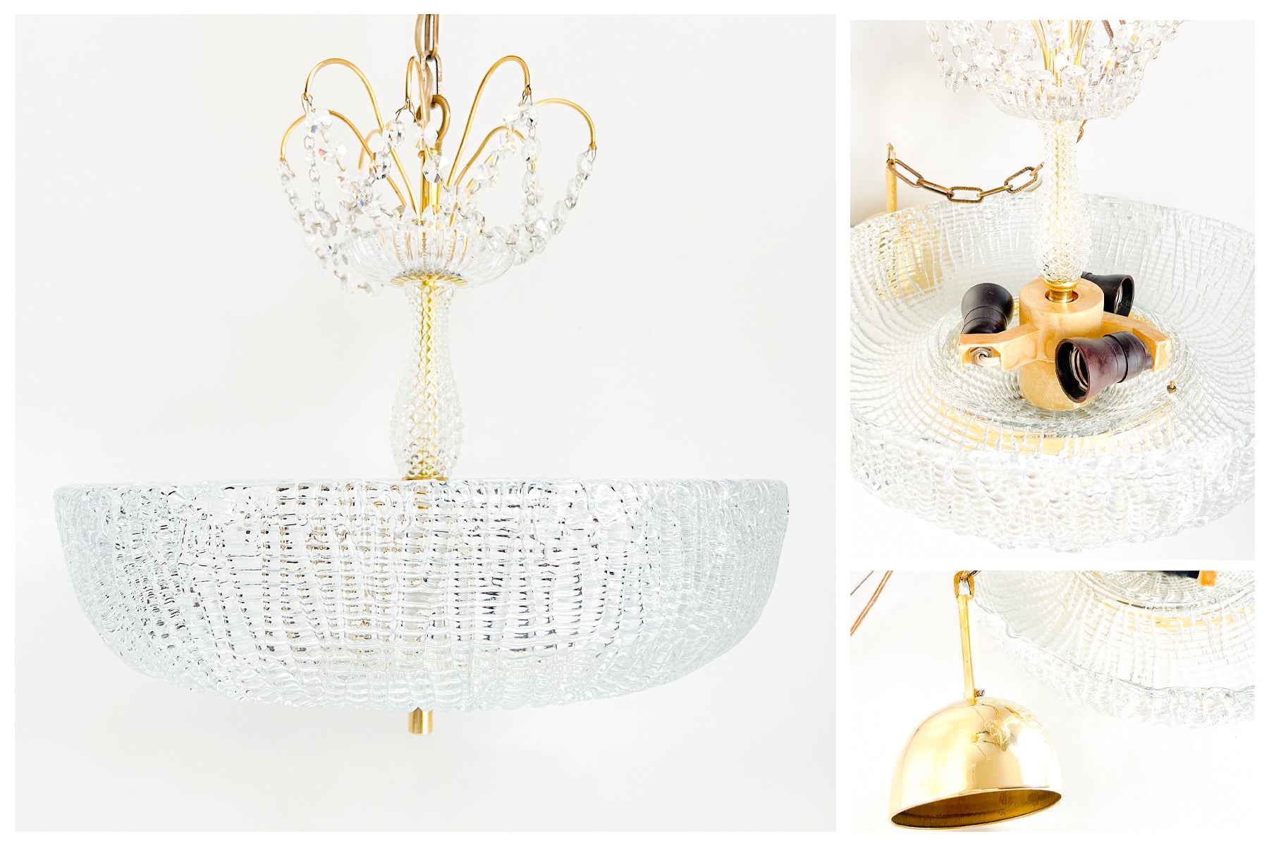The chandelier is unsigned. Based on its design, materials and comparable documented examples, it is most likely attributable to Kalmar (Austria) or to Carl Fagerlund for Orrefors (Sweden), both renowned for their high-quality mid-century lighting in brass and crystal.