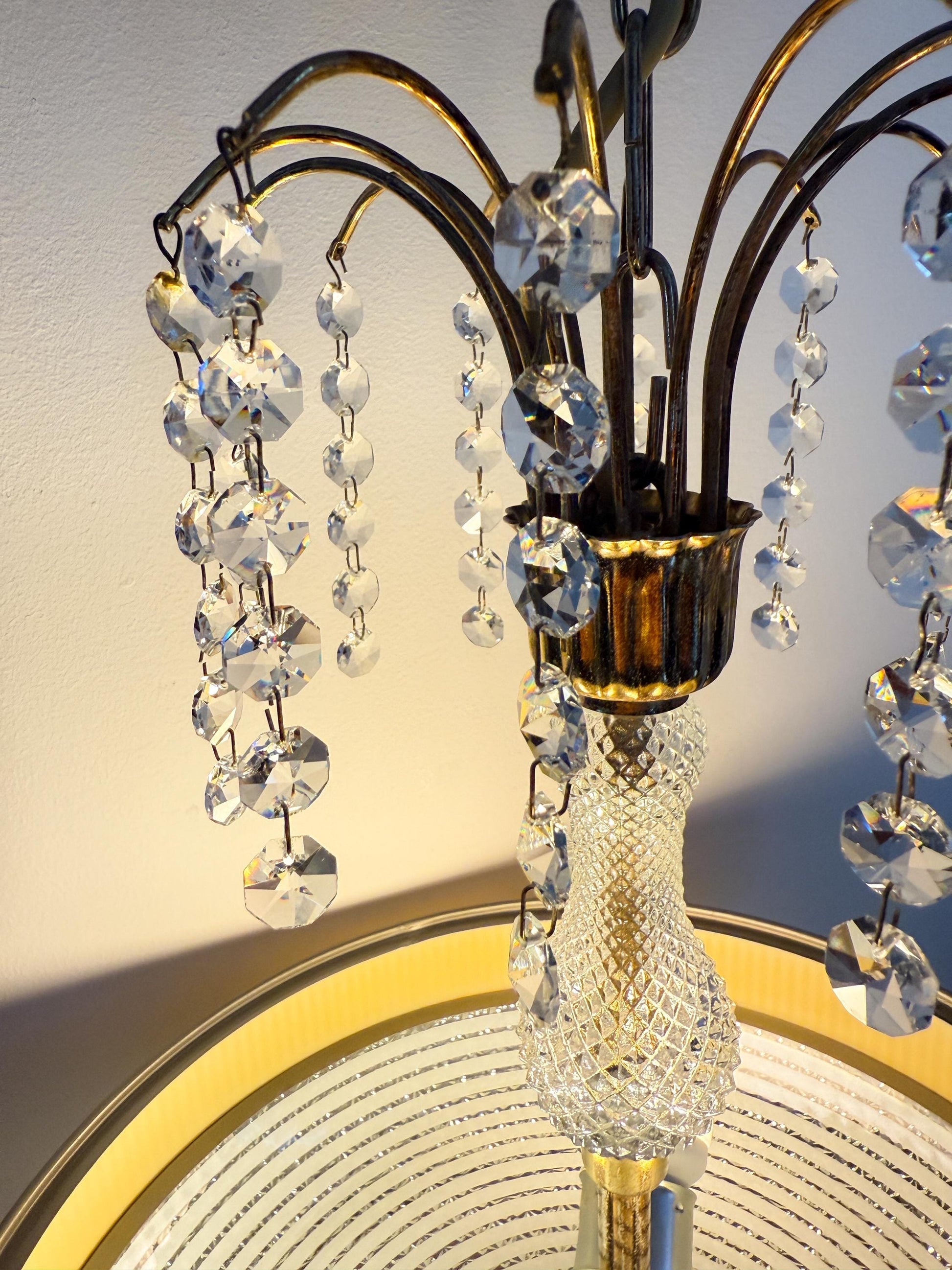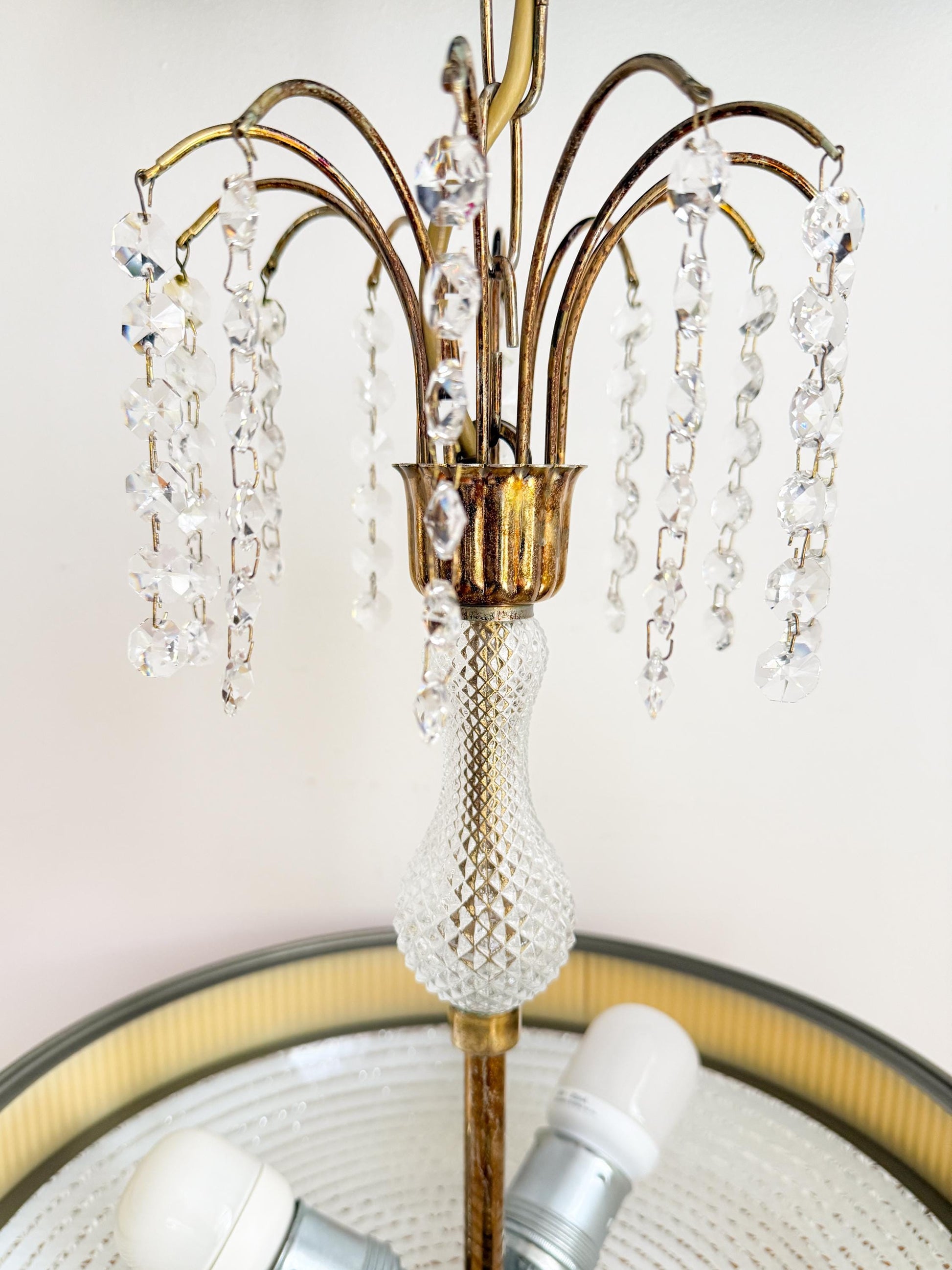 Crafted with a brass framework and textured glass, the pendant combines Mid-Century design with decorative refinement. The matte and transparent glass bowl, edged with a vertically striped metal rim, allows light to filter through softly, creating a gentle diffusion. Above, a vase-shaped glass stem sits beneath delicate brass arms adorned with hanging crystal drops, introducing a subtle play of sparkle and giving the lamp a sculptural and elegant presence.