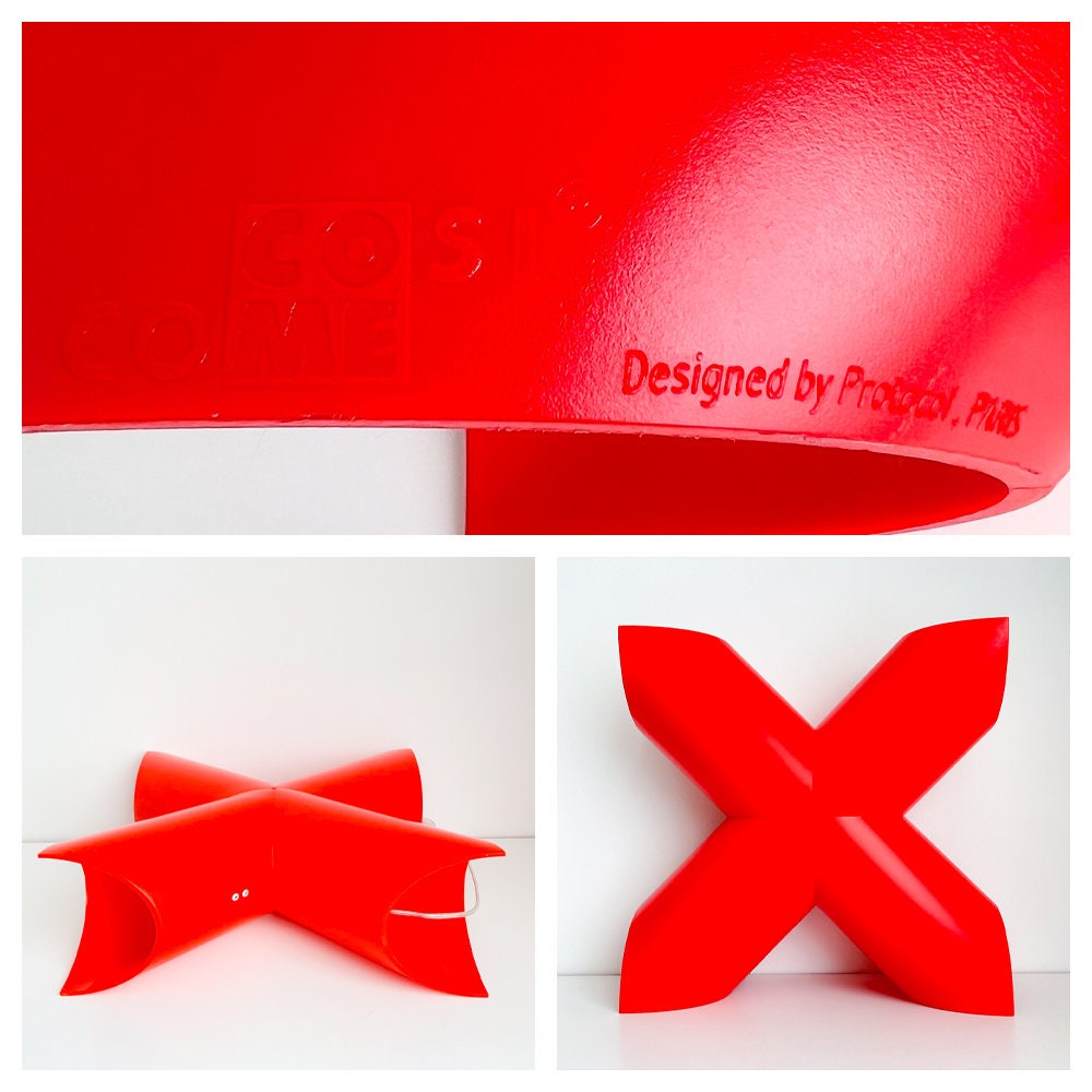 This is a vintage Cosi Come X lamp in a distinctive geometric design by Protocol Paris, crafted in durable hard plastic with a hollow-arm structure that allows light to diffuse beautifully into its surroundings.