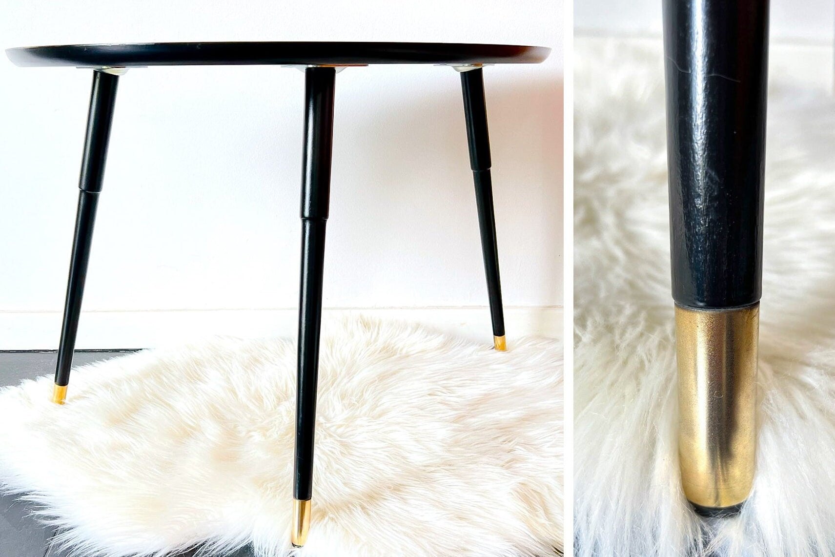 Featuring a veneered wood table top with a distinctive organic shape, this table rests on three slender black wooden legs finished with brass-toned metal caps. The design highlights thoughtful proportions and tactile material contrasts, giving it enduring appeal in a variety of interiors.
