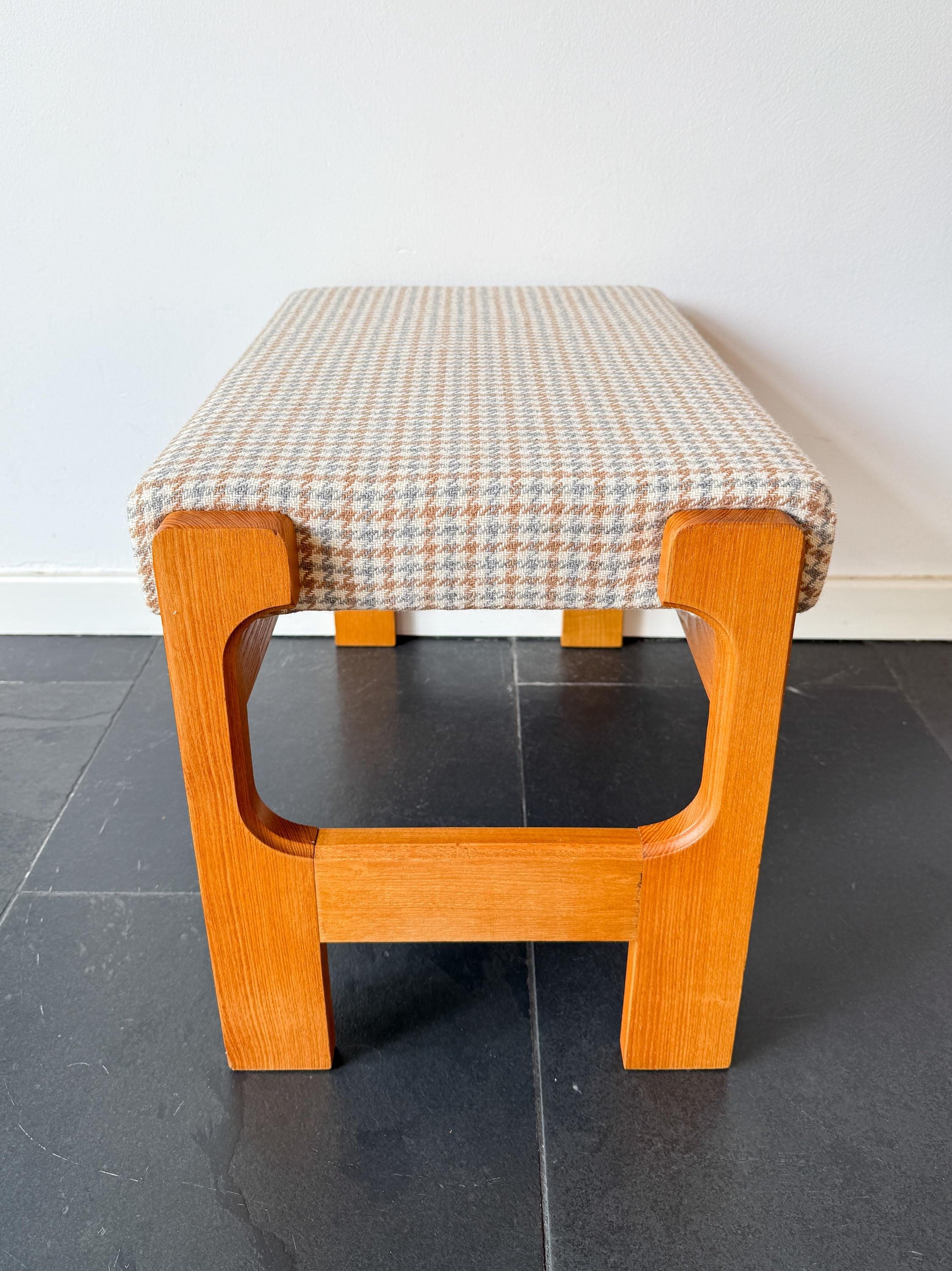 This footstool features a sturdy wooden frame paired with a houndstooth-style wool cushion in tones of beige, brown, white and blue, evoking the relaxed yet refined aesthetic of Scandinavian design. The unmarked piece likely originates from Scandinavia, with proportions that make it suited as a footrest, small ottoman or occasional seat.