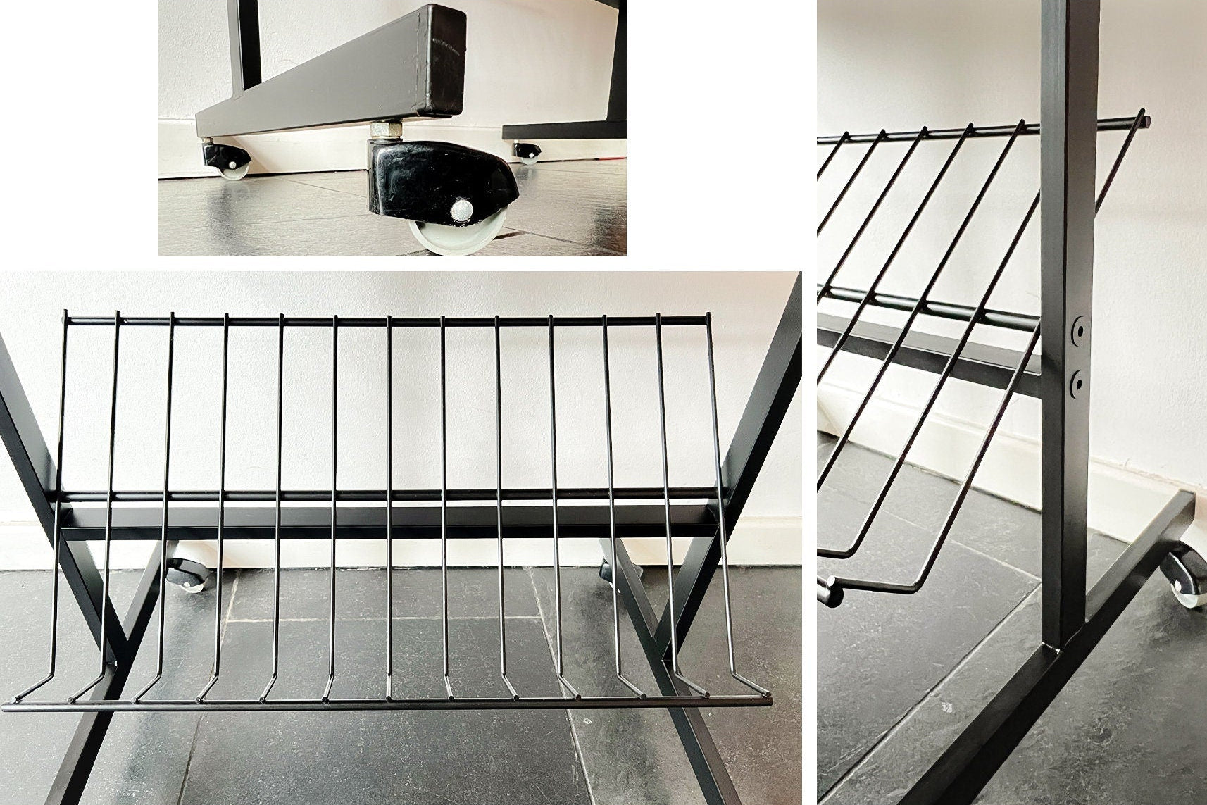 It features a sturdy rectangular wooden tabletop and a rotatable wire magazine rack beneath. The table rolls smoothly on casters and can be used as a side table, drinks table, TV stand or record table. The rack can be positioned horizontally or vertically, making it suitable for storing magazines, vinyl records or decorative accessories.