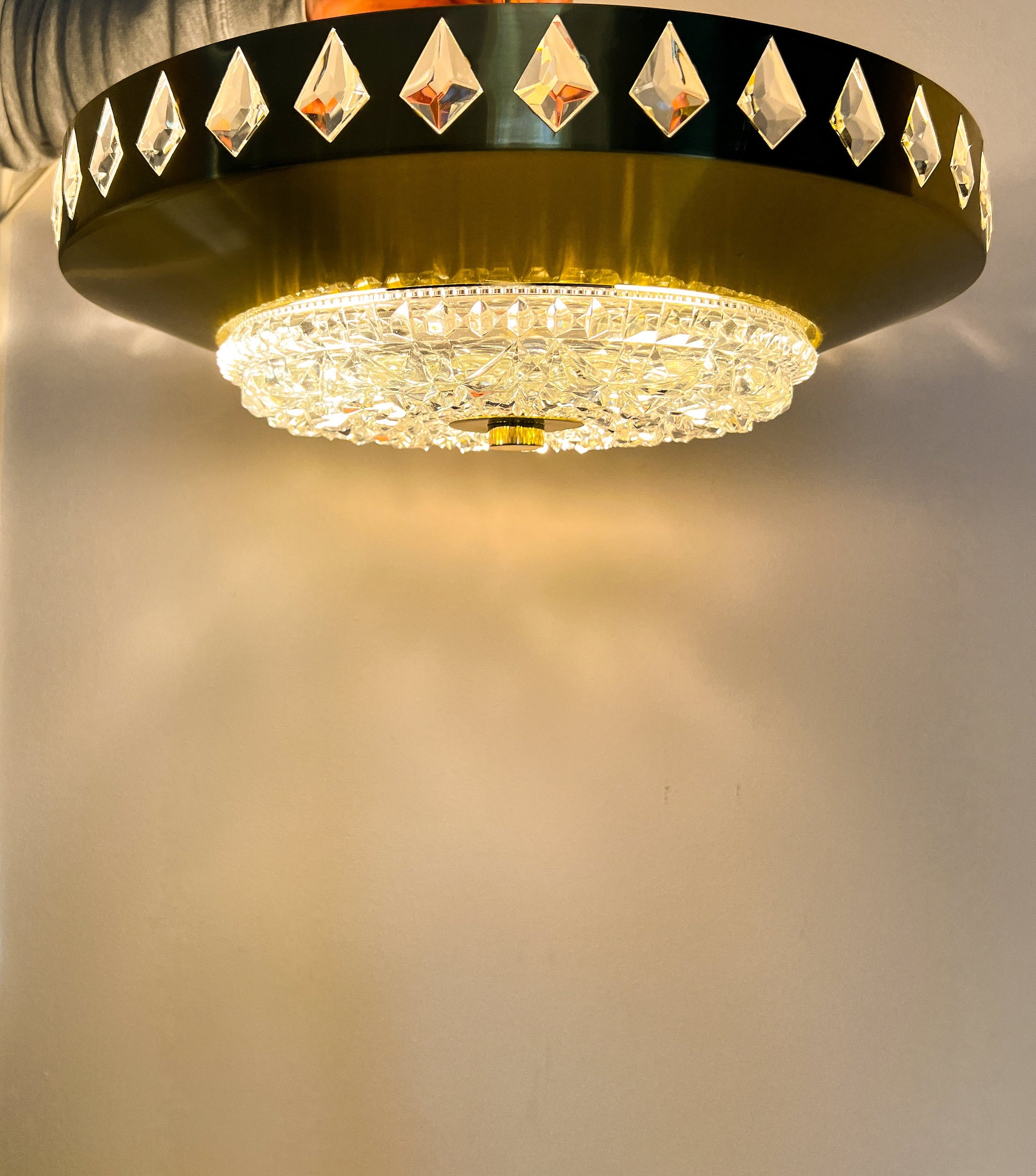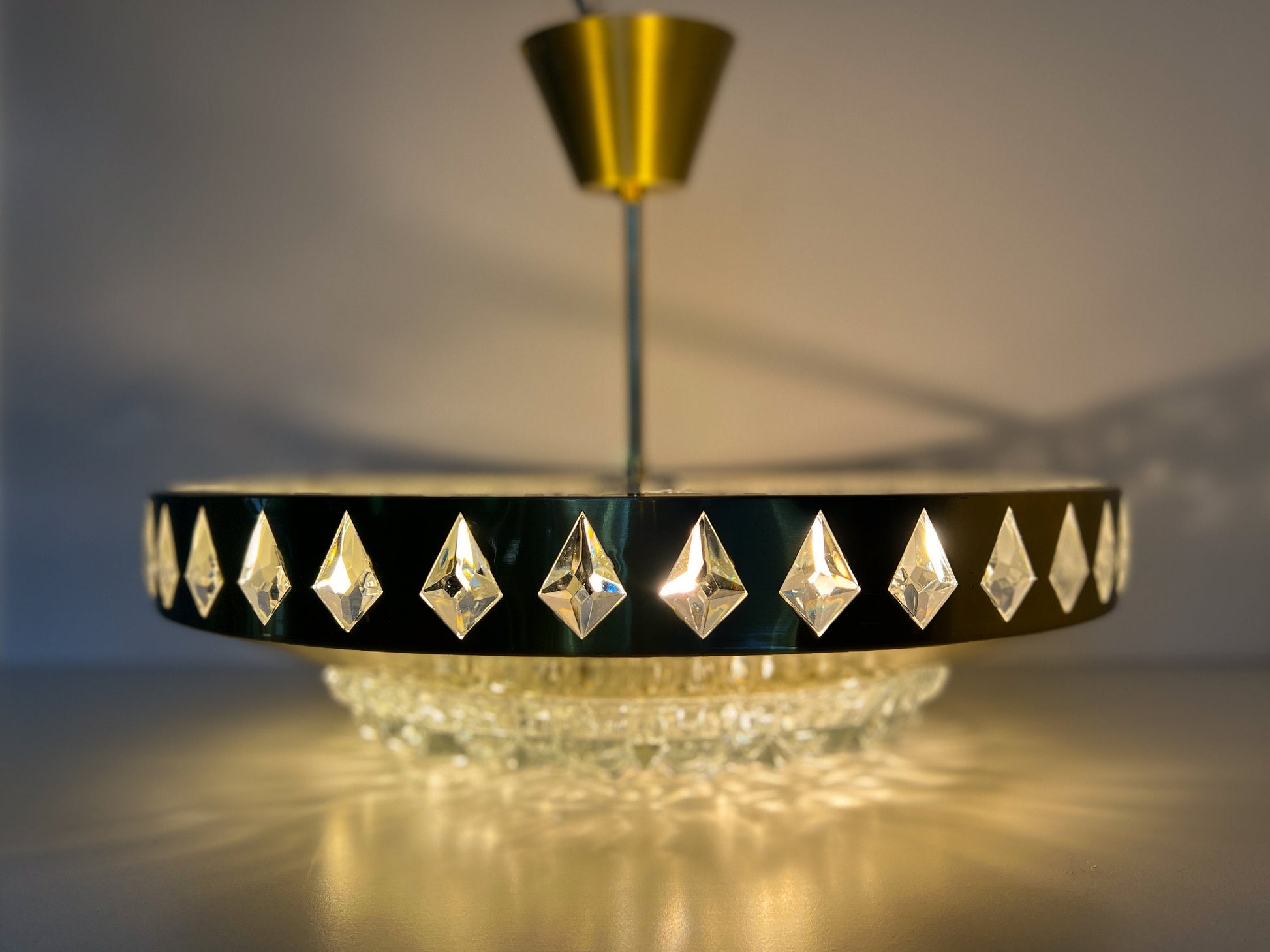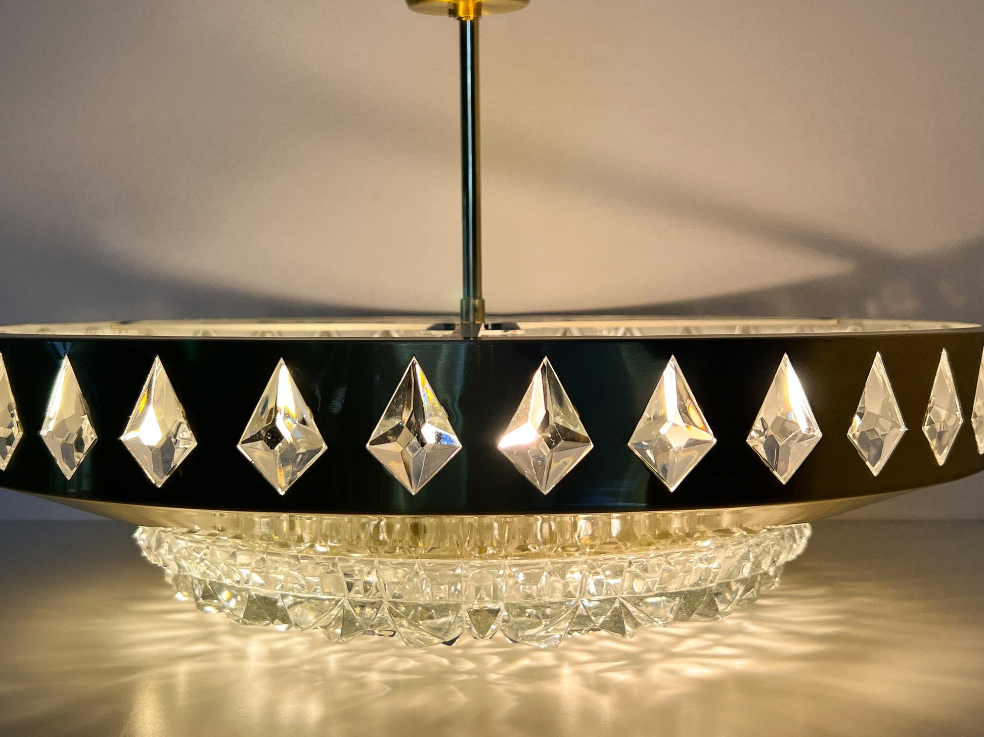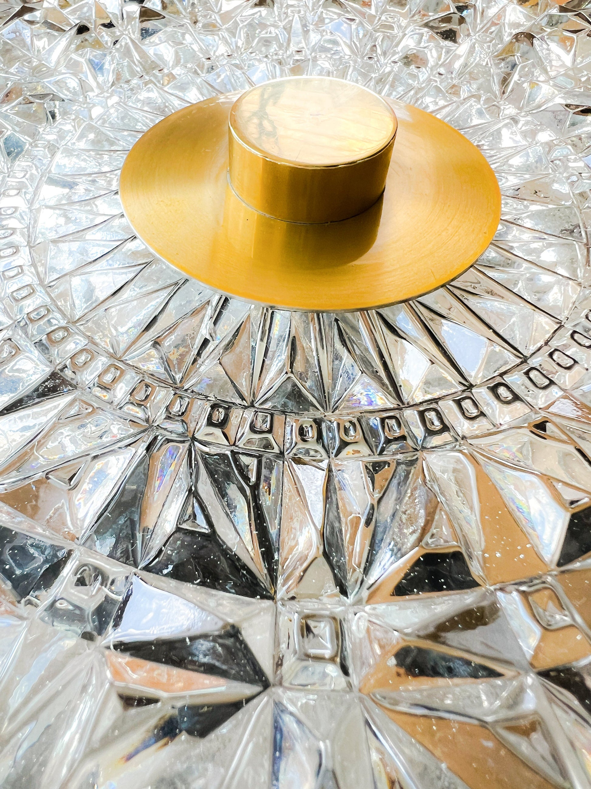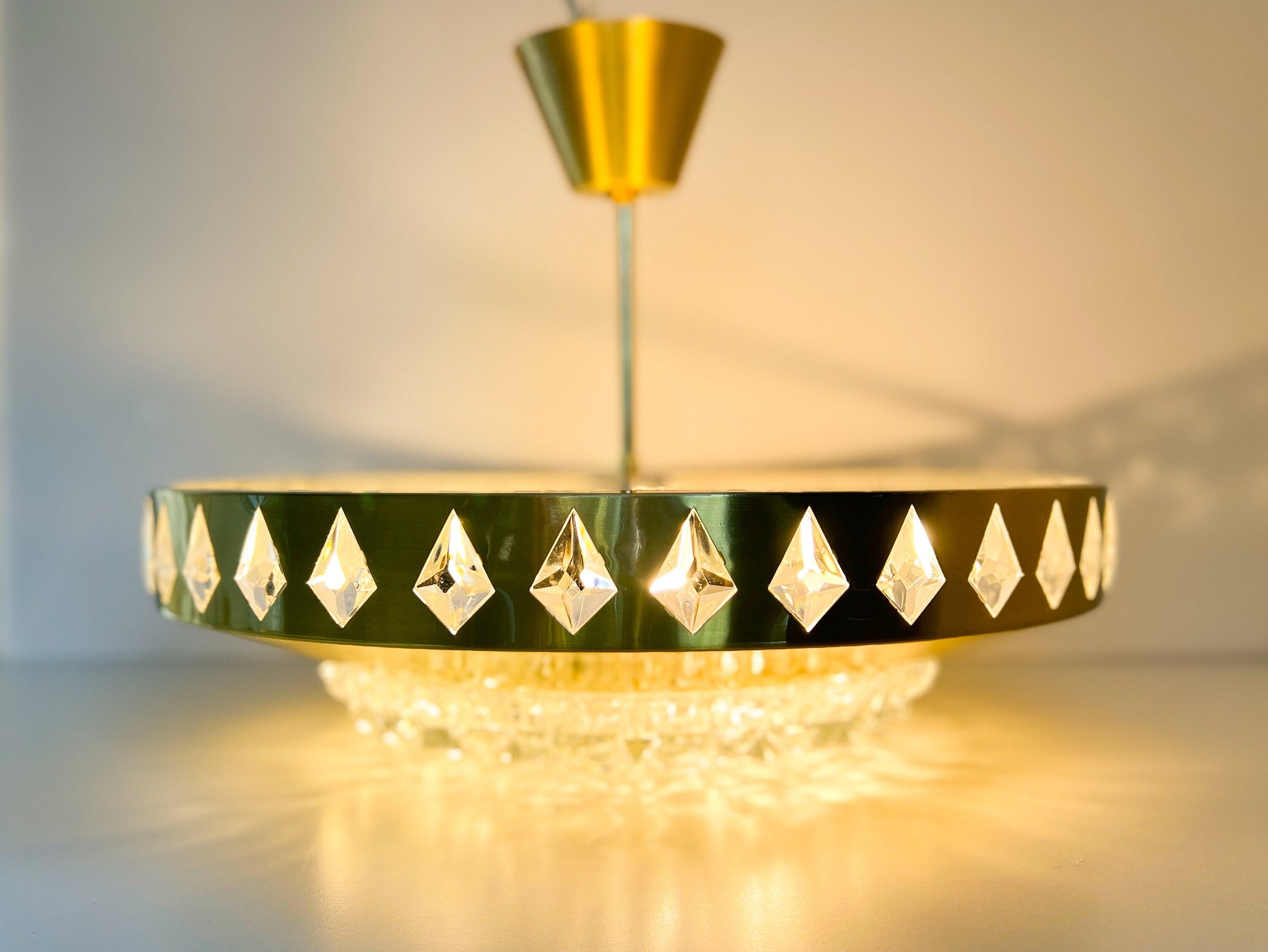 Defined by clarity of form and material, this mid-century pendant combines warm brass with faceted crystal glass to produce a soft, reflective glow and a balanced silhouette.
