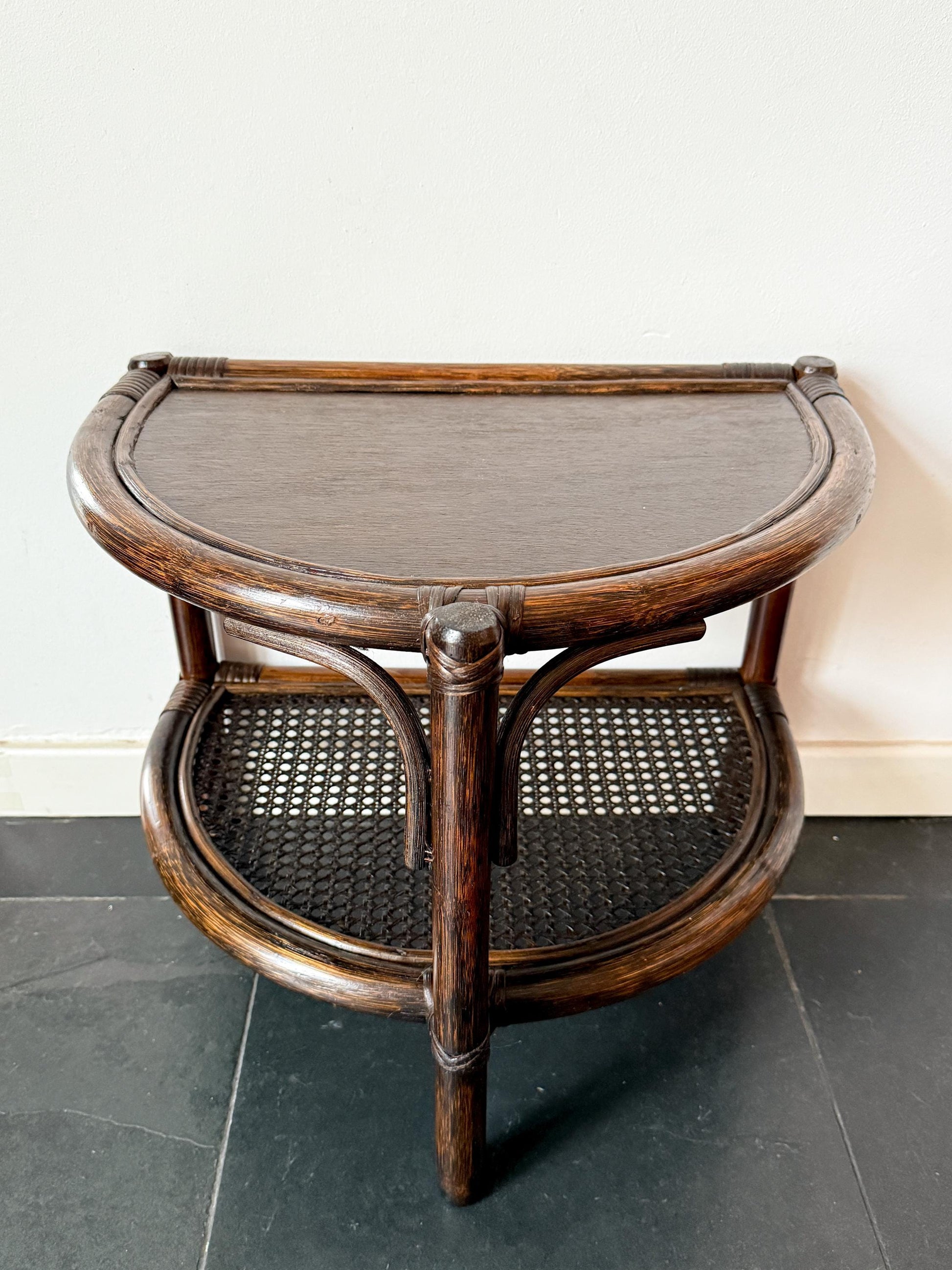 A vintage rattan and cane half-moon wall table with an organic form and refined woven detailing.