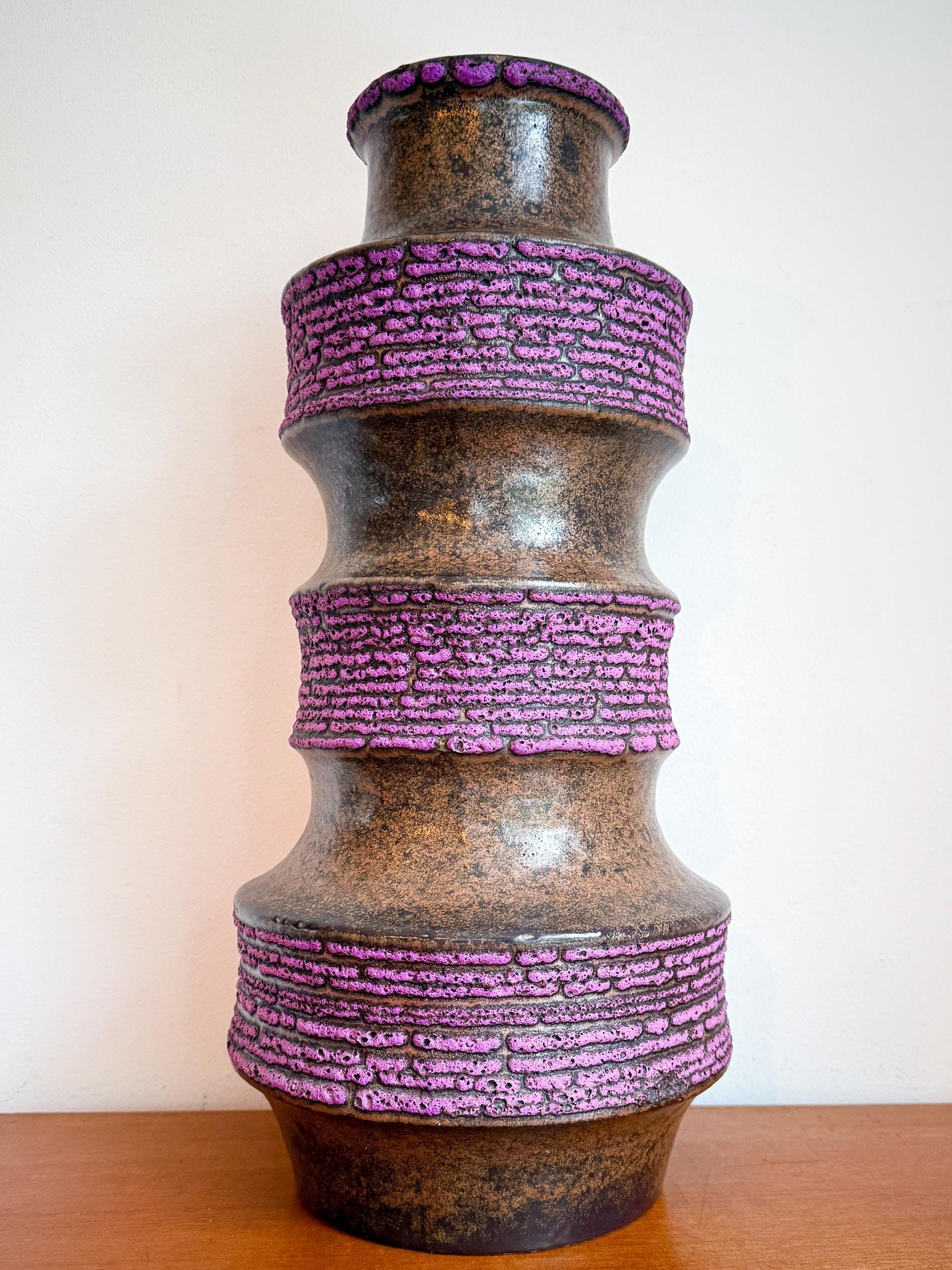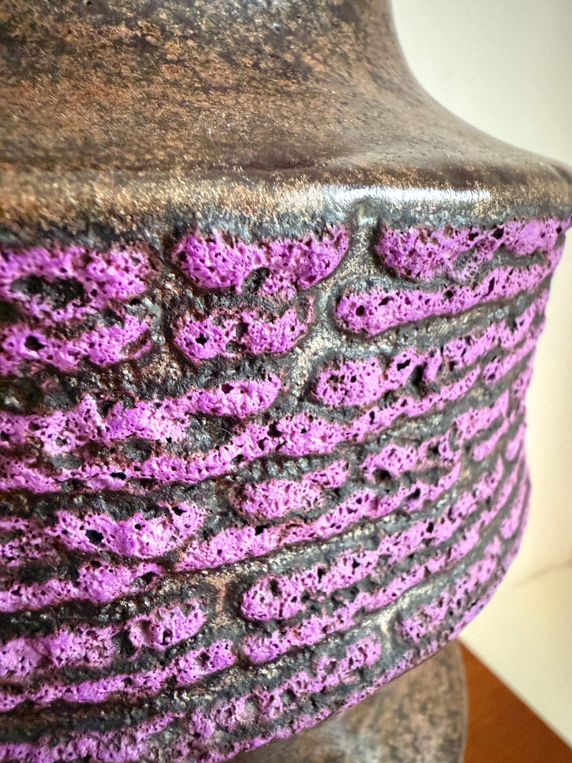 The vase is made from high-quality ceramic with a textured fat lava glaze, reflecting the craftsmanship Scheurich was renowned for during the 1970s. The layered form evokes architectural qualities, while the rich brown and purple hues add visual depth. Perfect as a statement décor object, it embodies the charm of vintage West German art pottery.