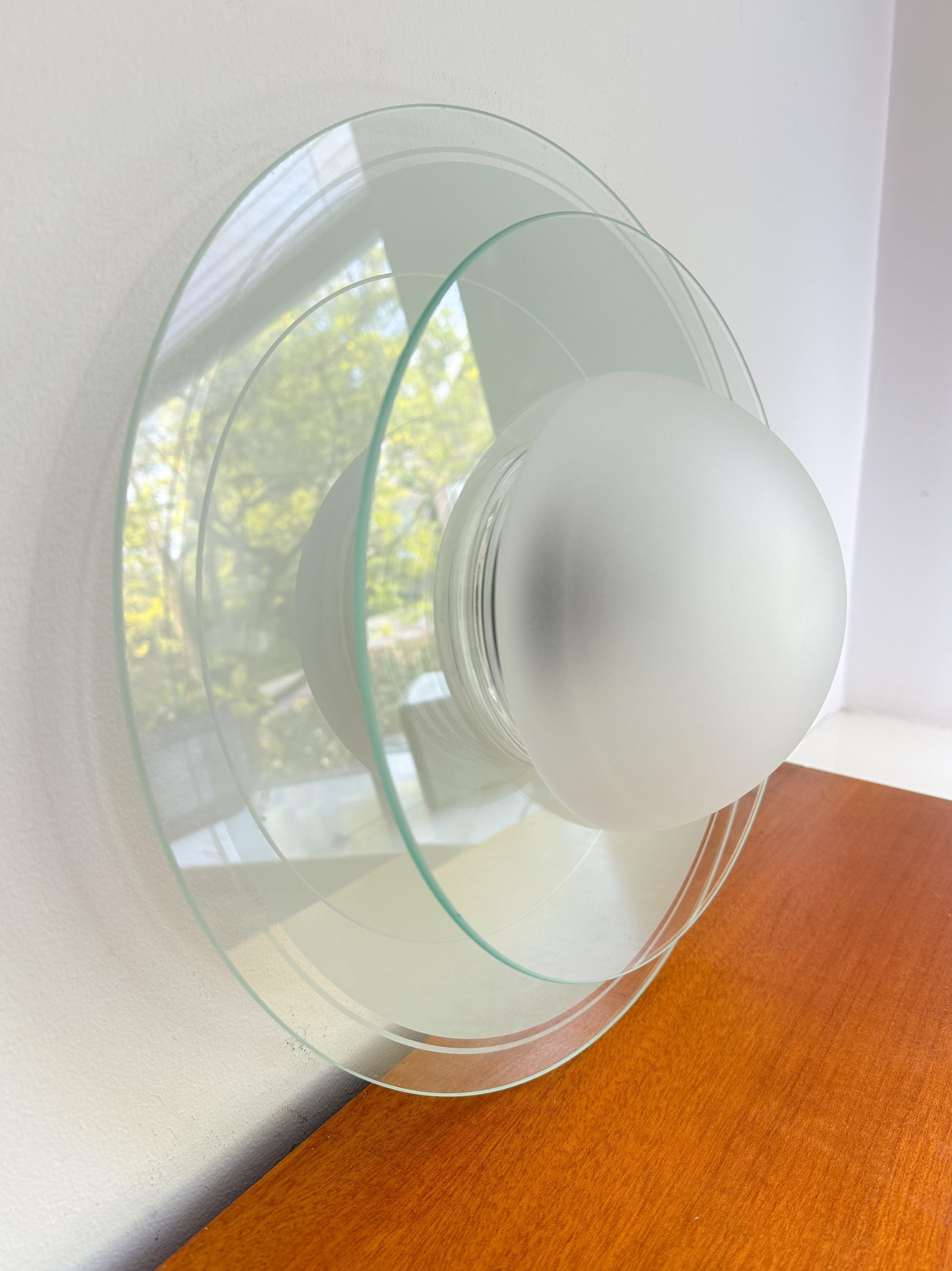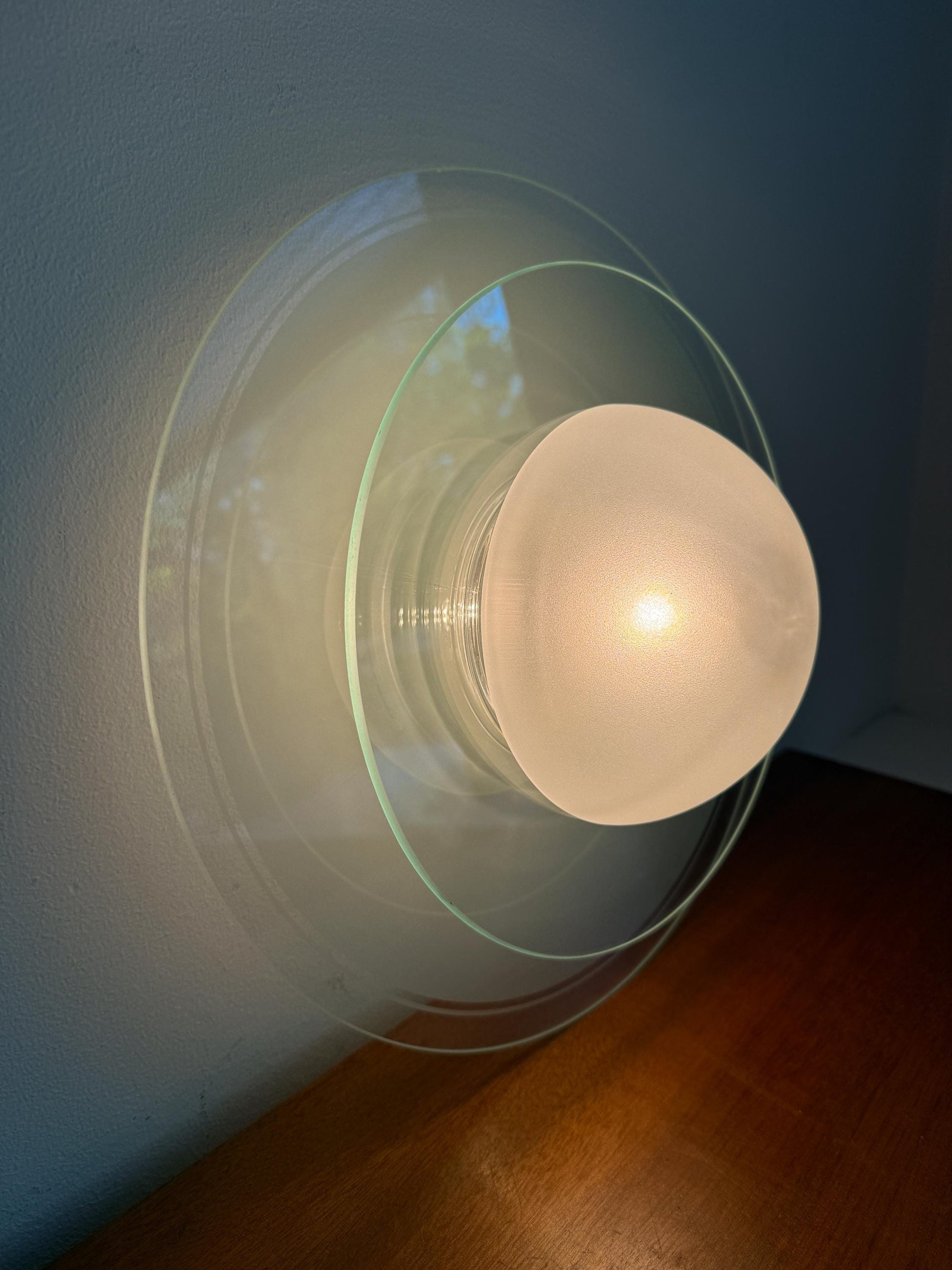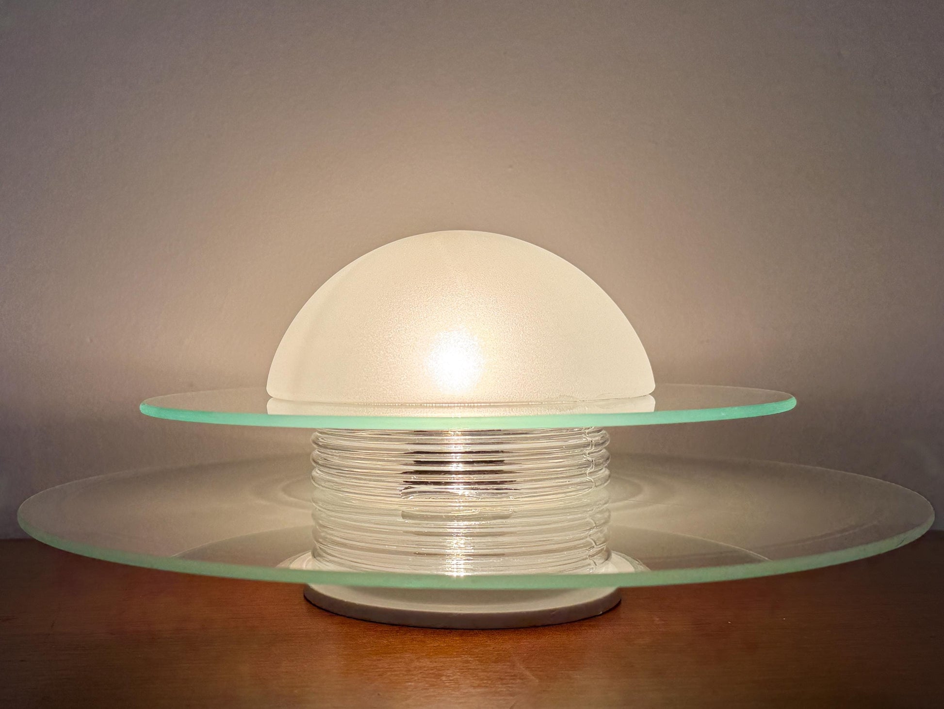 The lamp features a playful UFO-inspired silhouette composed of layered safety glass panels, a ribbed clear glass centre and a frosted glass hemisphere. Crafted from thick, refractive glass and mounted on a white base, it provides soft, diffused light suited to ambient settings. The layered construction interacts subtly with the bulb’s glow, while the sculptural form reflects the eclectic postmodern design language associated with Memphis aesthetics of the late 20th century.