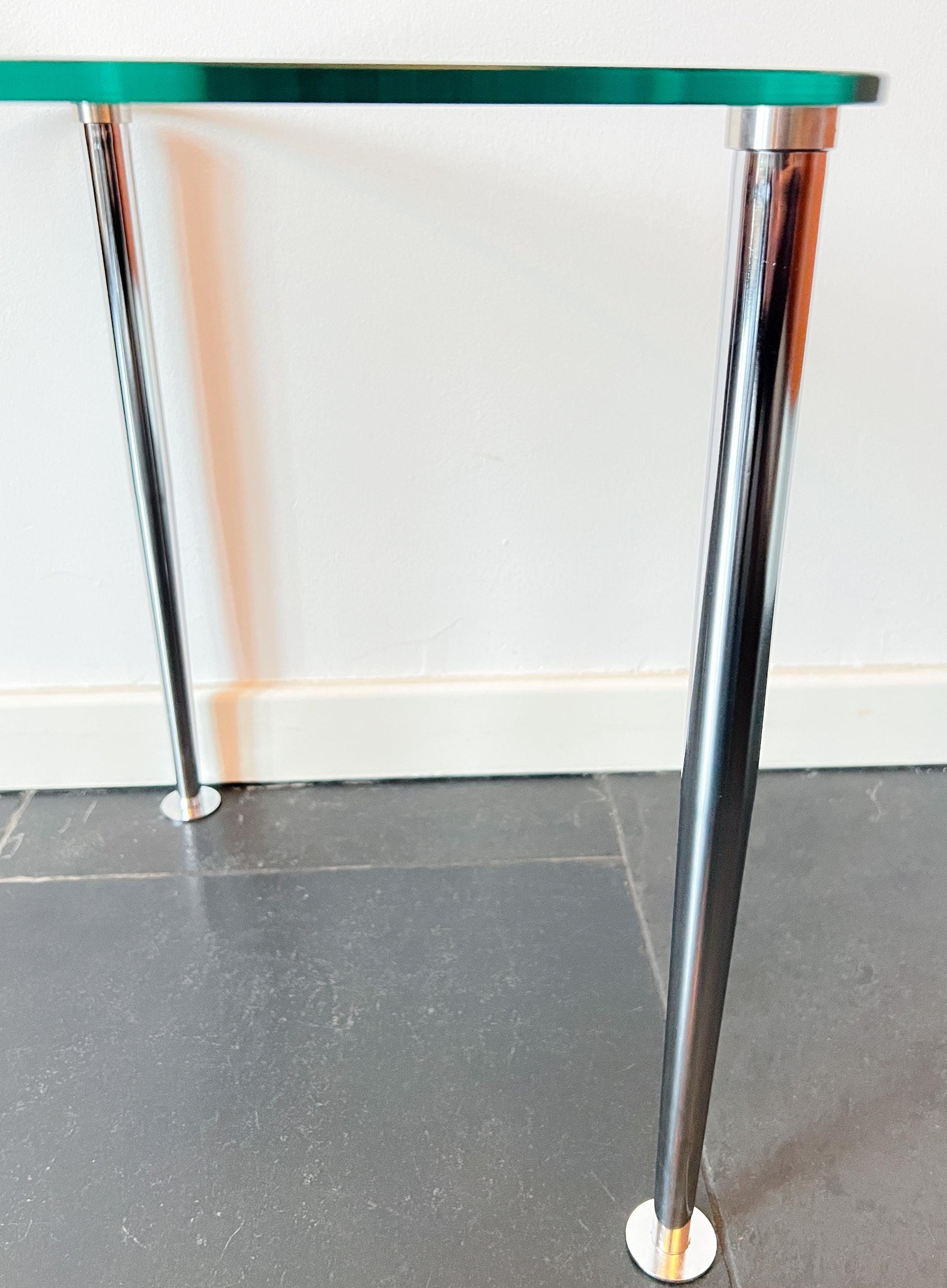 This triangular coffee table / side table is crafted with a thick tempered safety glass top supported by slim chrome metal legs. The clear glass surface and sleek chrome construction create a light, refined presence while remaining sturdy in use. Felt pads under the legs protect floors. The table is unmarked, but its design is reminiscent of German modernist furniture by Rolf Benz.