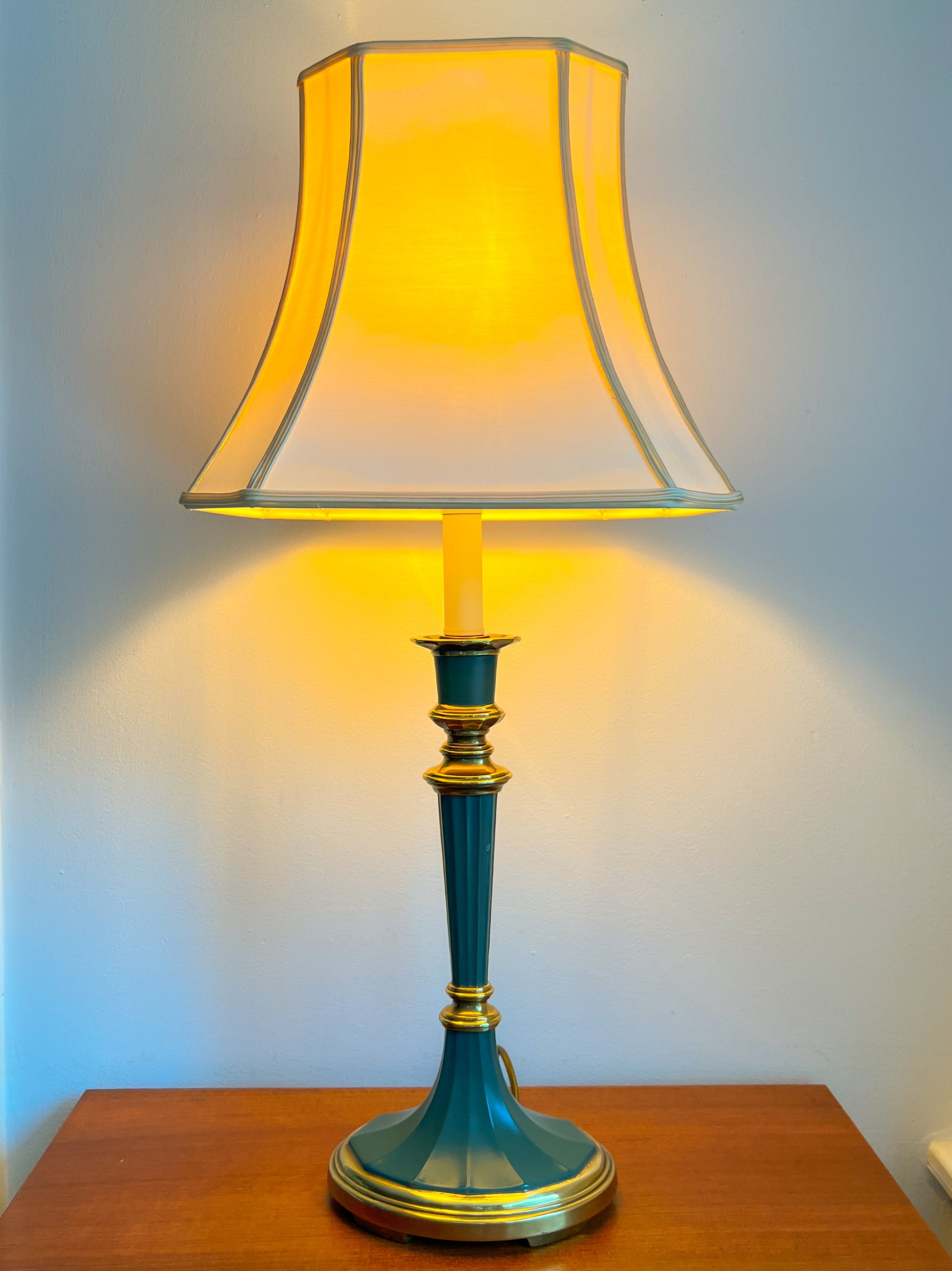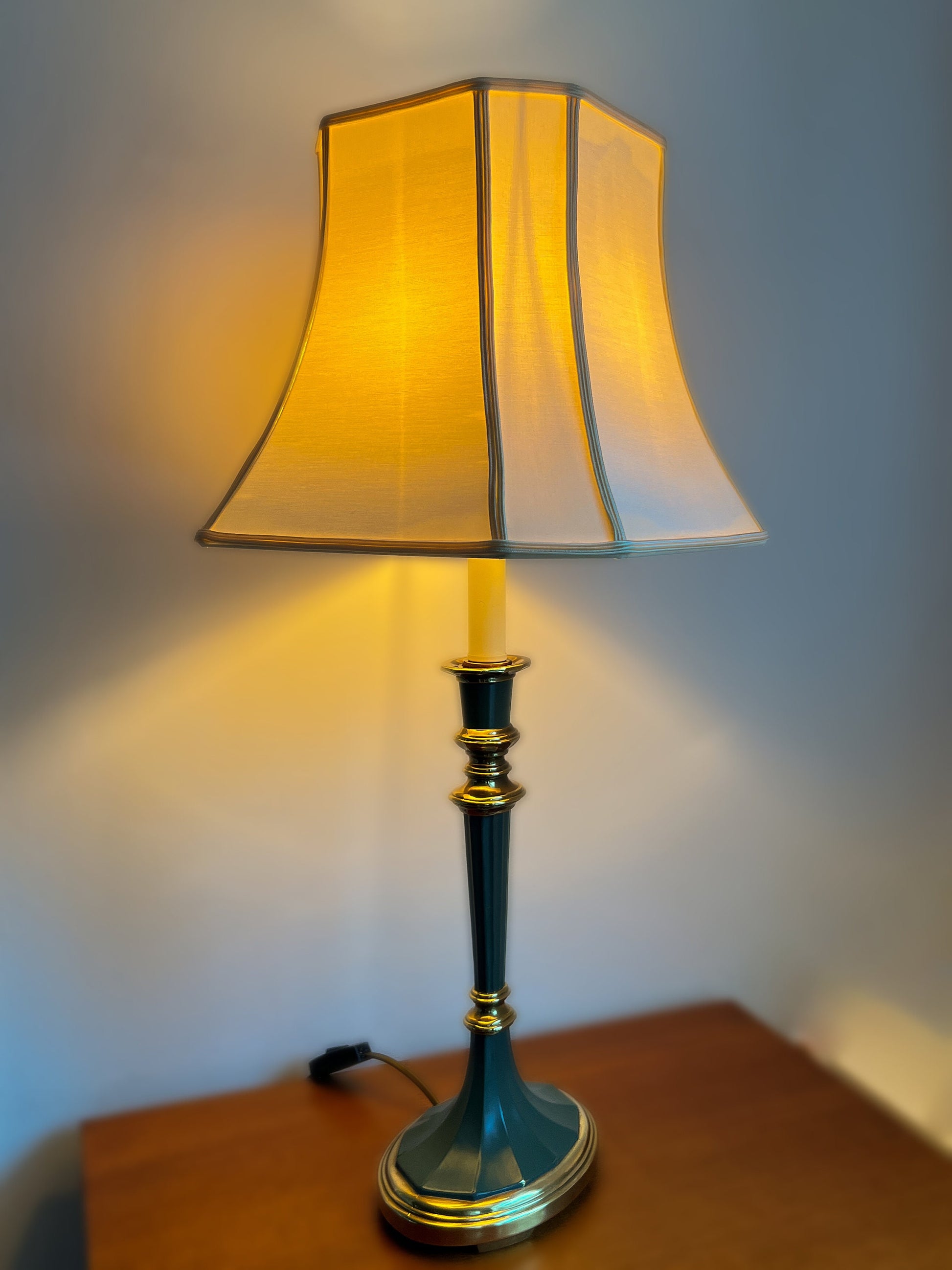 Crafted from heavy quality brass, this lamp has a stable oval base supporting a tapered column finished in English green and topped with a white candle-style top. The original Kullmann maker’s sticker, including model number No. 470/41, is preserved on the underside of the base, confirming its authenticity. It is completed with a matching ecru fabric lampshade finished with a beige trim.